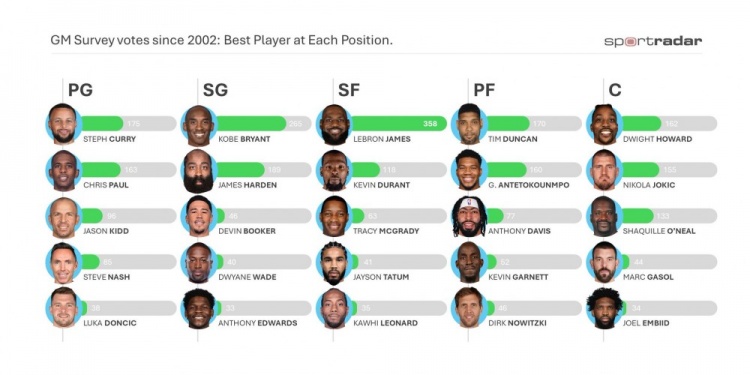 BasketballToday, NBA data expert Todd Whitehead counted the players with the most cumulative votes for "Best Player at Each Position" in the league's general manager surveys since 2002. Shooting guard: Curry 175 votes Shooting guard: Kobe Bryant...