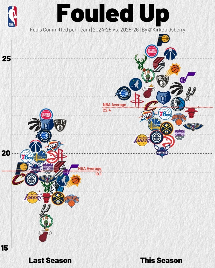 Last season, the league's teams averaged 19.1 fouls per game; this season, the number is 22.4. (Data as of today’s pre-game)