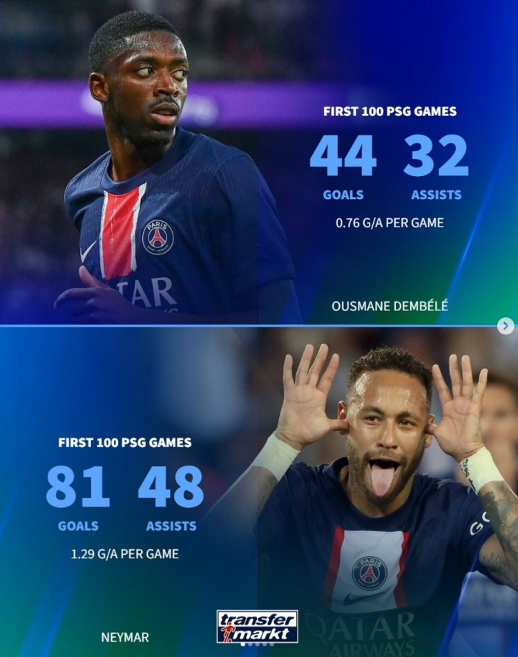 Dembele has 44 goals and 32 assists in 100 games in Paris, but his efficiency in the same period is still lower than Neymar, Ibrahimovic, and Mbappe