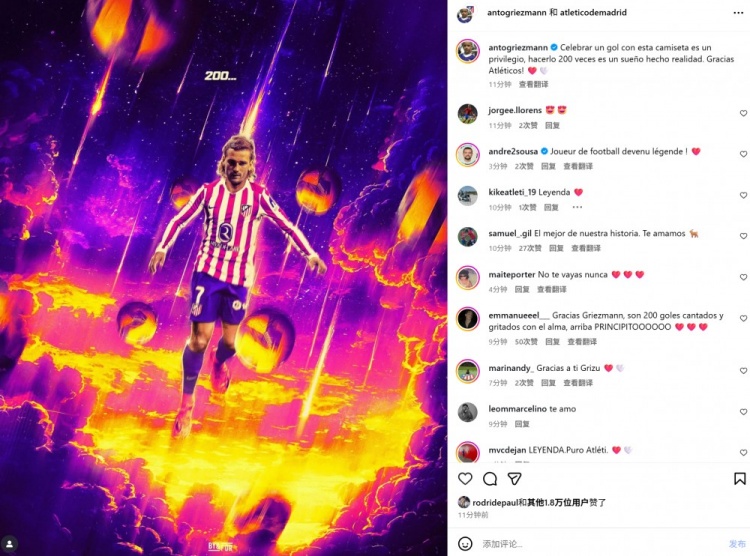 Griezmann scored a goal in this game, reaching the milestone of Atletico Madrid's 200-scoring goals in his career. After the game, he also posted a poster on his personal social media, writing: "It is an honor to wear this jersey to celebrate the goal, and being able to do this 200 times is a dream come true. Thanks to all the fans!"