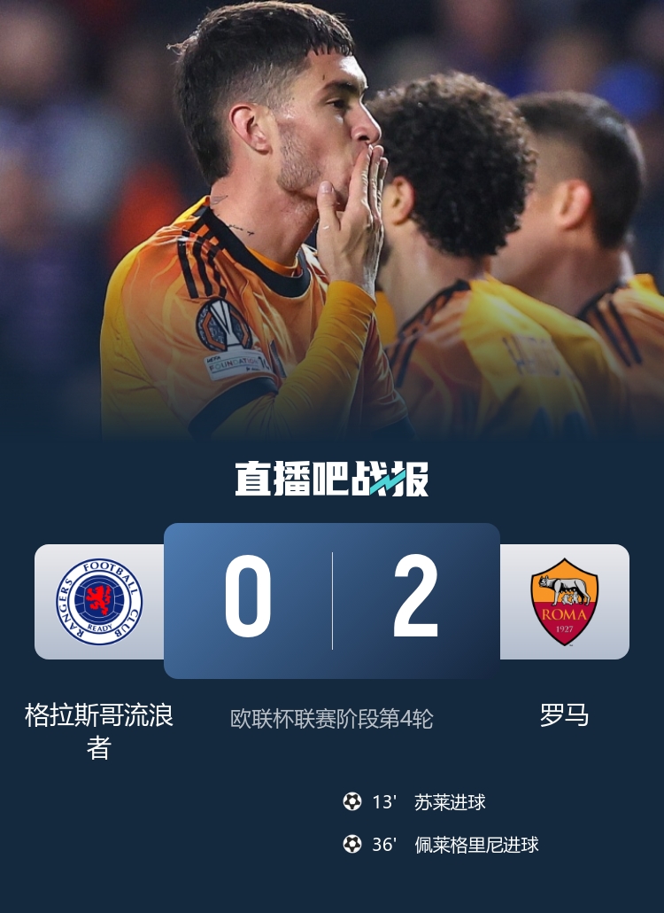 Sule and Pellegrini scored, and Celik missed an empty goal. Roma ended its two-game losing streak in Europe with 6 points from 4 games, while Rangers were at the bottom with 0 points.