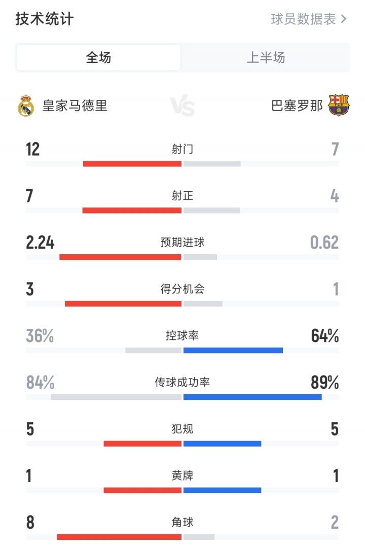 DunSports > Football > National Derby half-time statistics: Real Madrid 12 shots, 7 goals, expected goals 2.24, Barcelona 7 shots, 4 goals