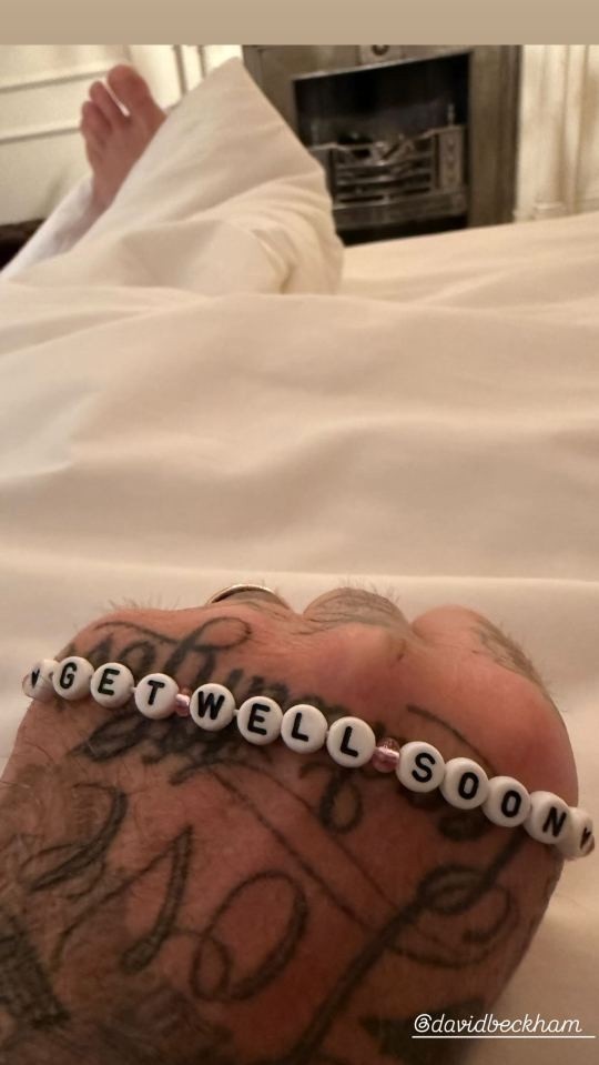 Beckham's 51-year-old wife Victoria sent a warm blessing to her husband on Instagram this morning: "A quick recovery, dad." The "golden right foot" was photographed smiling and wearing a blue suspender on his arm. Another photo shows Beckham also wearing a cute wristband that says: "Speed recovery."