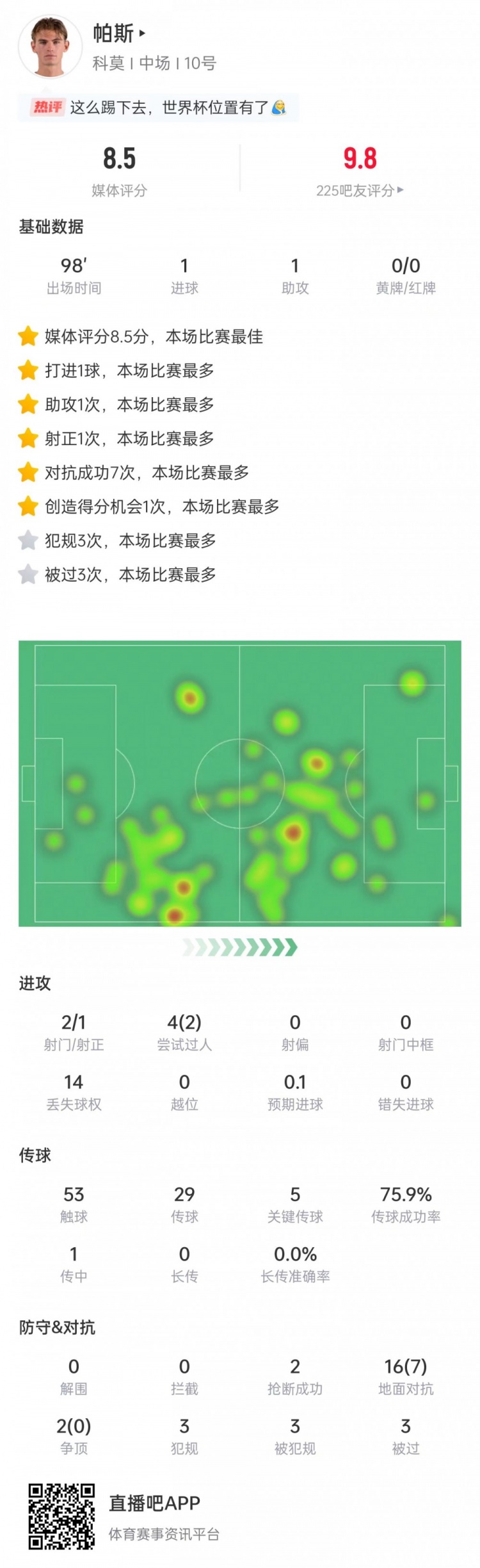 Paz s statistics for this game: Passing, shooting and achievement + 5 key passes, and he was rated 8.5 points, the highest in the game.