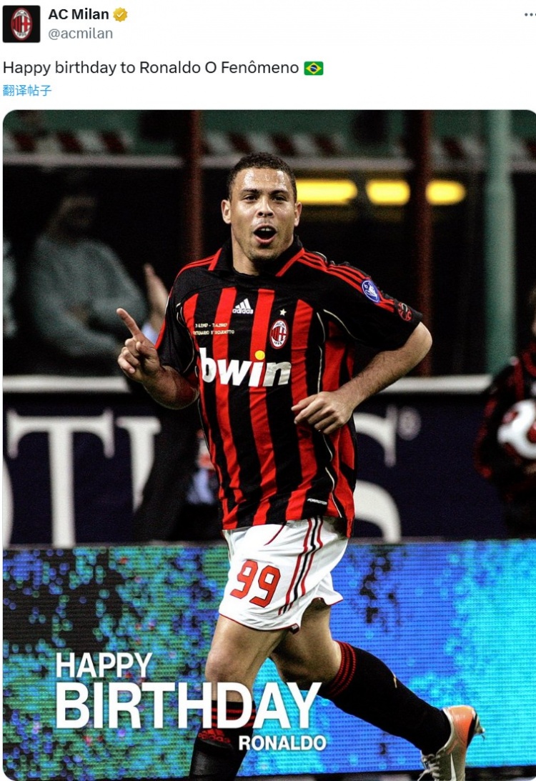Today is the 49th birthday of Brazilian legend Ronaldo, and his former boss AC Milan also posted a poster to send him birthday wishes.