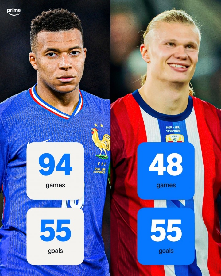 Haaland and Mbappe have the same number of goals for the national team, but Mbappe has played 94 games, and Haaland has only played a little more than half of Mbappe's games.